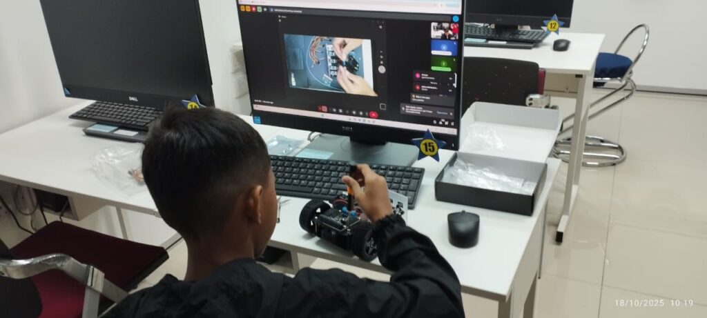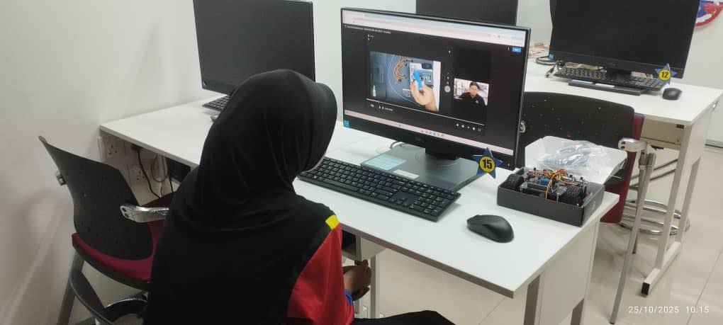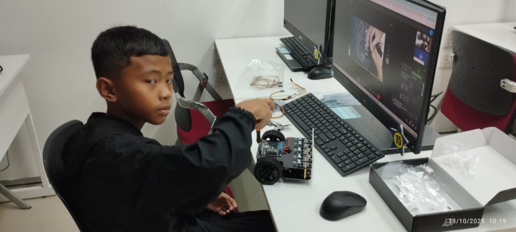 Peserta belajar mengaturcara pergerakan asas dengan Microbit dan cara memasang robot sumo